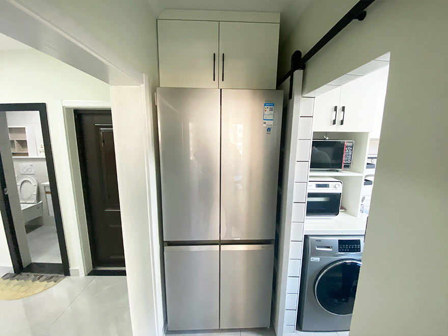 設(shè)計(jì)師拆除了原廚房外的壁櫥,將四開(kāi)門冰箱放置在了這里,利用愛(ài)格板定制家具增加了冰箱上方空間的儲(chǔ)物。