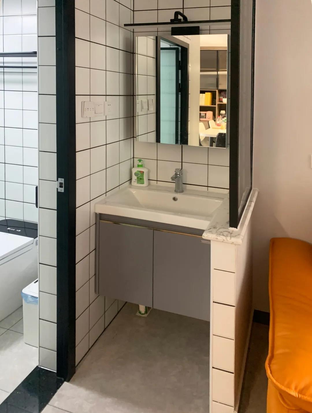 4、提高衛(wèi)生間私密性,實(shí)現(xiàn)干濕分區(qū)衛(wèi)生間面積3平米,內(nèi)部格局十分不合理,淋浴區(qū)正對著門,洗衣機(jī)就在淋浴區(qū)旁邊,并且沒有任何儲物空間。