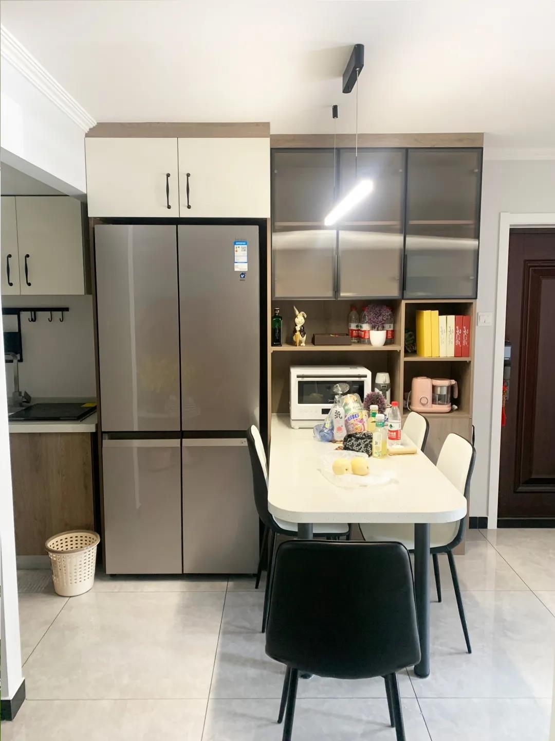 設(shè)計師拆掉了廚房與客廳間的部分墻體,同時也拆掉了廚房與門廳間的整面墻體,在此區(qū)域?yàn)楹闻恳患掖蛟炝瞬蛥^(qū),融合門廳空間,整個區(qū)域有12平米,通頂餐邊柜,滿足平時儲物需求,四開門冰箱也從廚房外移到這個位置,整個空間實(shí)用美觀。