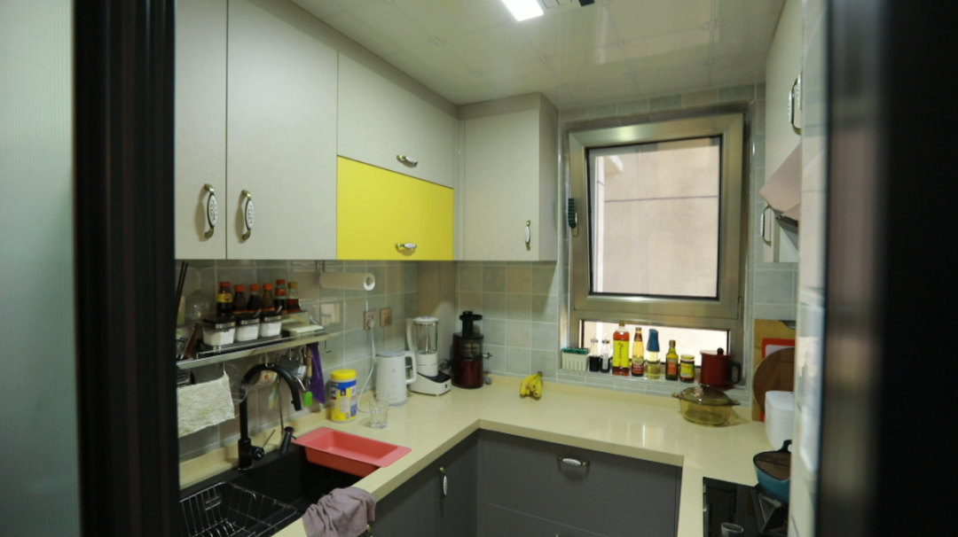 設(shè)計(jì)師將廚房的墻體延長(zhǎng)了5厘米,冰箱外移到過(guò)道區(qū)域,這樣,廚房里打造一組U字形的整體櫥柜,洗切炒動(dòng)線合理,儲(chǔ)物功能強(qiáng)大,方便好用。