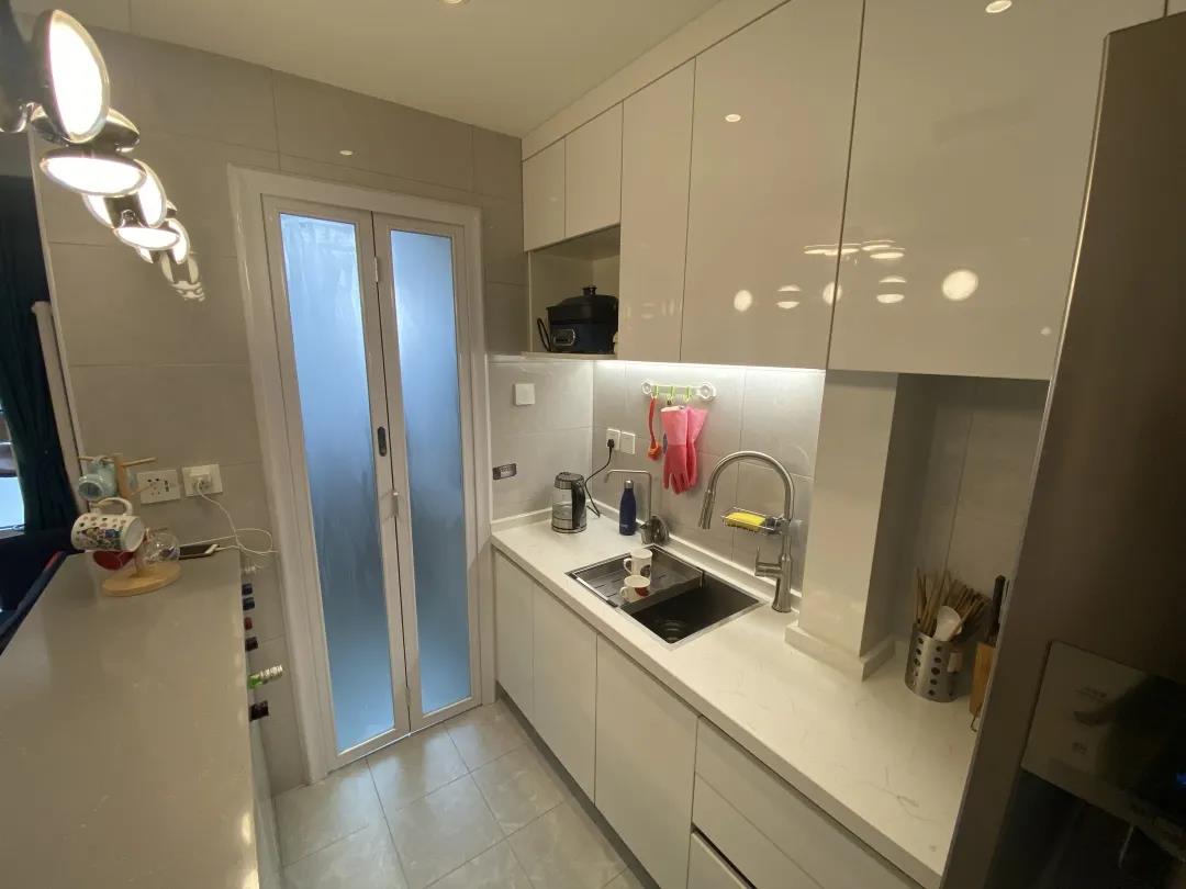 廚房改為開放式的,將煙機(jī)灶具移至和廚房連接的陽臺,一組折疊門,打造了一個封閉式的炒菜區(qū),阻隔油煙的同時給廚房節(jié)省出更多的儲物、操作空間。