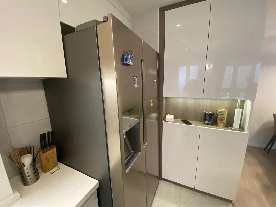 冰箱也移至廚房,廚房里拿、放、洗、切、炒,動線流暢合理。吧臺的設(shè)計,既可以儲物,也可以當(dāng)作操作臺,同時還可以當(dāng)作臨時的就餐臺,一舉多得,很是愜意。