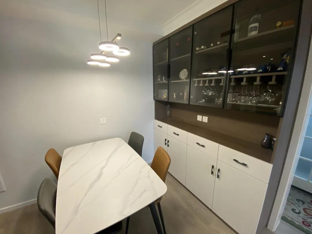 拆除原有客廳和陽臺的推拉門,將陽臺這5平米也納入到餐客廳,將這23平米空間,進(jìn)行了重新布局。餐區(qū)除了擺放餐桌外,還設(shè)計一組餐邊柜,用來解決餐區(qū)儲物。