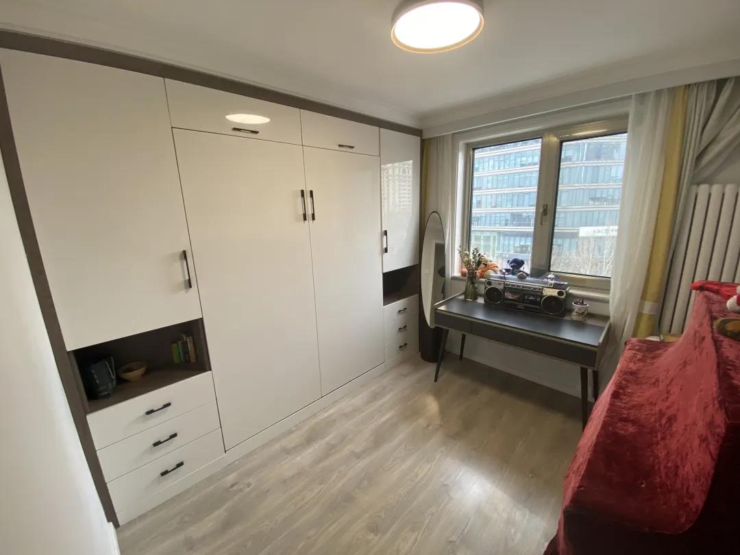 設(shè)計師首先拆除了門廳與廚房相連的這部分輕體墻。與煙道齊平,做了一組鞋帽柜,不占用原有門廳空間,門廳變得寬敞。衣帽柜足夠滿足老兩口平時的儲物需求,頂面和柜體增加了光源來解決門廳的采光,折疊換鞋凳,可放可收,既不占用空間,又解決了老兩口坐著換鞋的需求。