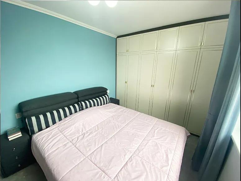 設(shè)計(jì)師利用定制家具沿著這面墻體,為李女士孩子的婚房打造了一組通頂衣柜,保溫的同時(shí),儲物充足、既美觀又實(shí)用,雙人床擺放在這里,也不影響平時(shí)的正常出入。