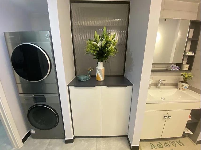 由于被門廳借用了部分面積,被壓縮后的衛(wèi)生間有2.3平米,設(shè)計(jì)師在這里保留了如廁和淋浴的功能。借用原本客廳和臥室的部分空間,修建兩面U字型墻體,一面規(guī)劃為洗漱區(qū),另一面放置了洗衣機(jī)和烘干機(jī),實(shí)現(xiàn)了干濕分區(qū),解決了洗衣難題。