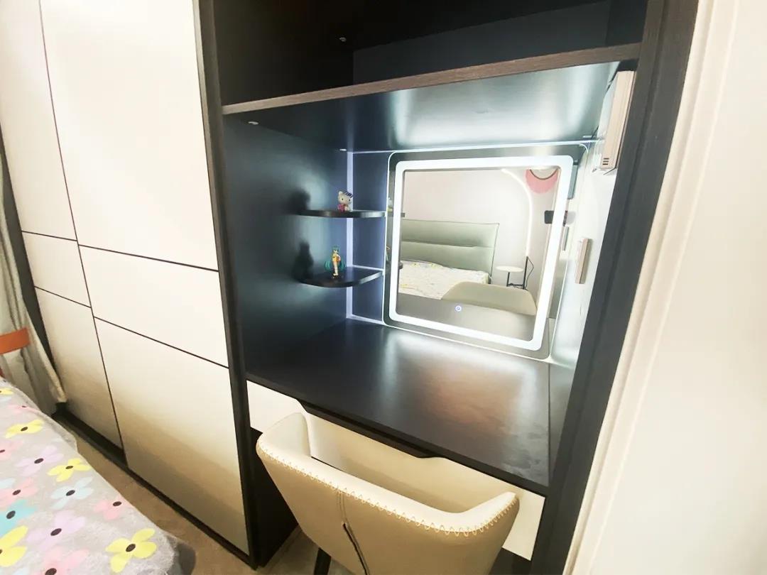 設(shè)計(jì)師將這間臥室重新調(diào)整,一整面的通頂衣帽柜滿足了臥室的儲(chǔ)物需求,而梳妝臺(tái)也是必不可少。