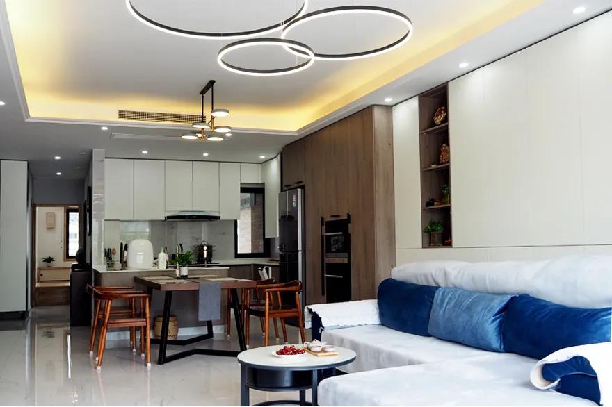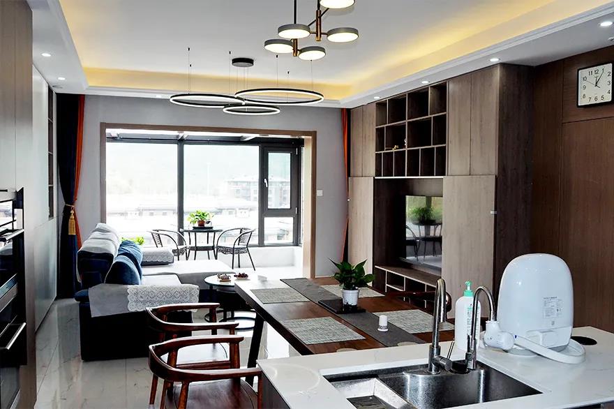 設(shè)計師客廳和陽臺的推拉門拆除,將陽臺區(qū)域納入到客廳里,改造后的客廳與過道、廚房、餐區(qū)、陽臺形成了一個大的開放空間,整體空間達到了56平米,徹底實現(xiàn)了王先生想要的開闊式客廳。沙發(fā)、茶幾依次擺放,設(shè)計師利用定制家具為業(yè)主打造了電視柜和客廳儲物柜,有藏有露,實現(xiàn)了一家人想要的大容量儲物。陽臺則打造成休閑區(qū),與朋友喝茶、聊天的同時,欣賞窗外的美景,公共區(qū)域整體空間大氣、溫馨、舒適。