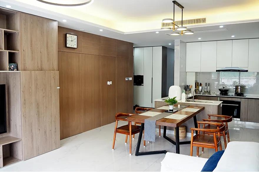 設(shè)計師拆除了廚房的兩面輕體墻,將封閉式廚房改為開放式。一組G字型櫥柜,洗切超動線合理,超大的臺面設(shè)計,滿足了王先生操作的同時,還能擺放下不少的小家電,觸碰式升降電源的設(shè)計讓廚房更顯科技感。再配合大容量吊柜、地柜和電器儲物柜,設(shè)計師將儲物空間做到了極致,餐區(qū)沿著洗手臺將用餐區(qū)域擺放在這里,做飯的同時還能與餐區(qū)進行無障礙互動,整體家庭氛圍更加融洽、和諧。
