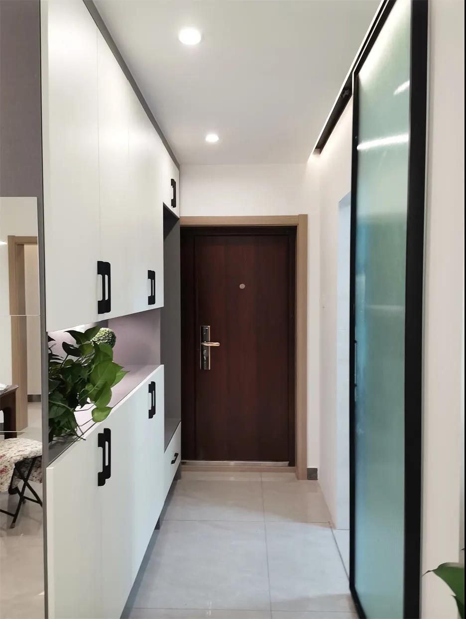 與門廳鞋帽柜相對的廚房門,設計師貼心的設計為推拉門,推拉門的使用完全不會影響到門廳和廚房空間,另外,地軌嵌入到瓷磚里,確保地面無障礙。
