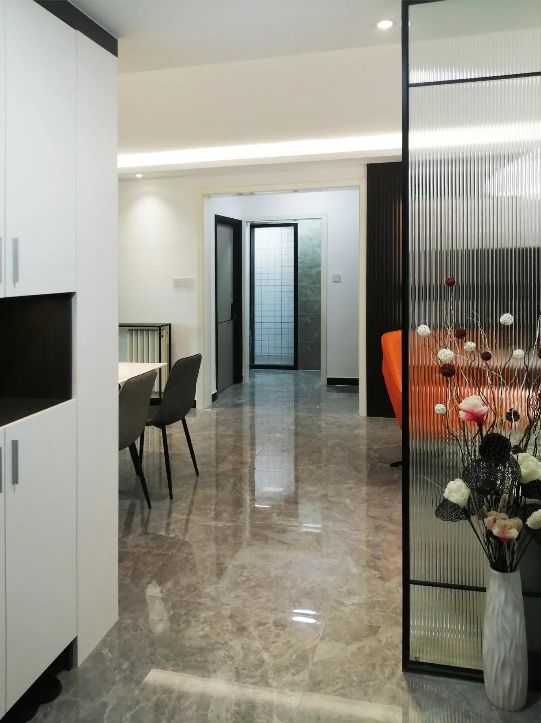 為了解決門廳采光差,缺少儲物的難題,設(shè)計師將入戶門正對的輕體墻更換成長虹玻璃,既起到了隔斷作用,保護(hù)了隱私,又解決了采光難題。同時封堵原有廚房門,在這里打造了一組通頂鞋帽柜,解決了一家人進(jìn)出的儲物收納難題。