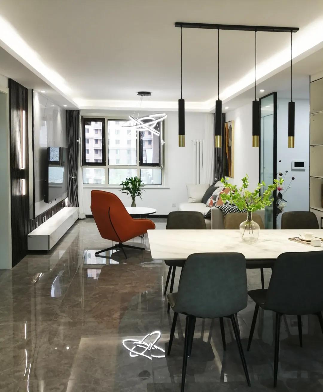 設(shè)計師將原有次臥與客廳相鄰的輕體墻向臥室方向挪動了80厘米,客廳從22平米擴(kuò)大到25平米,沙發(fā)、茶幾、電視柜依次擺放。同時,在這里規(guī)劃了用餐區(qū)域,1.8米乘以90厘米的多人位巖板餐桌,滿足趙女士親戚朋友來家聚會的需求,借助玄關(guān)柜的側(cè)面,設(shè)計師也為餐區(qū)進(jìn)行了餐邊柜的設(shè)計,改造后的餐客廳,通透、明亮。