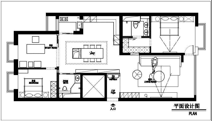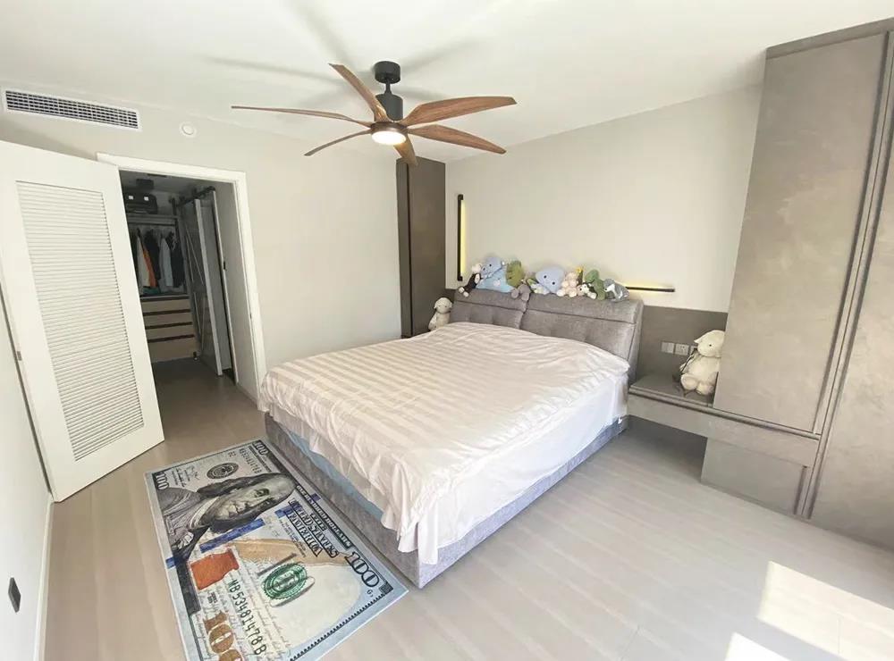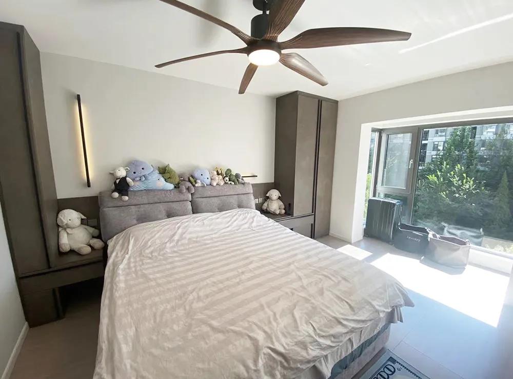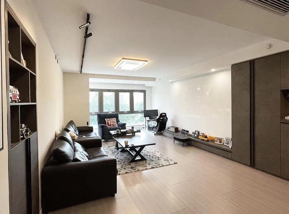 設(shè)計師封堵了主臥門洞,將臥室門改在異形陽臺施工洞位置,使客廳整體空間更好布局。將沙發(fā)墻進(jìn)行調(diào)整,移到了對面位置,隱藏式幕布滿足了業(yè)主自由式觀影方式,隱藏式窗簾使空間更加簡約,同時也最大限度的增加了客廳的采光面,調(diào)整布局后,業(yè)主職業(yè)需要的賽車模擬器也有了充足的空間。