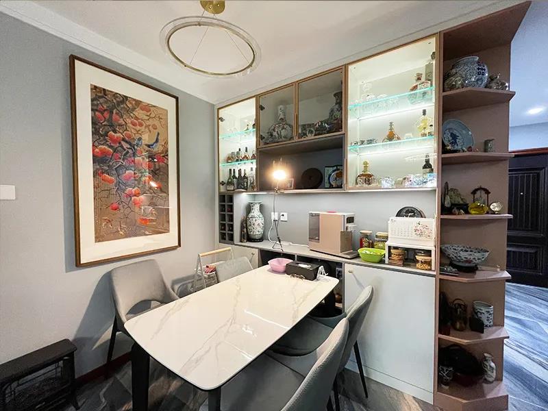 設(shè)計(jì)師利用定制家具打造了一組餐邊柜,增加了客餐廳的儲(chǔ)物空間,玻璃柜門結(jié)合燈帶,更顯大氣,使展示一覽無余。