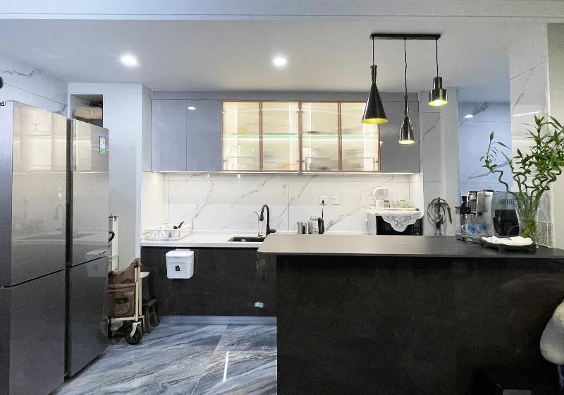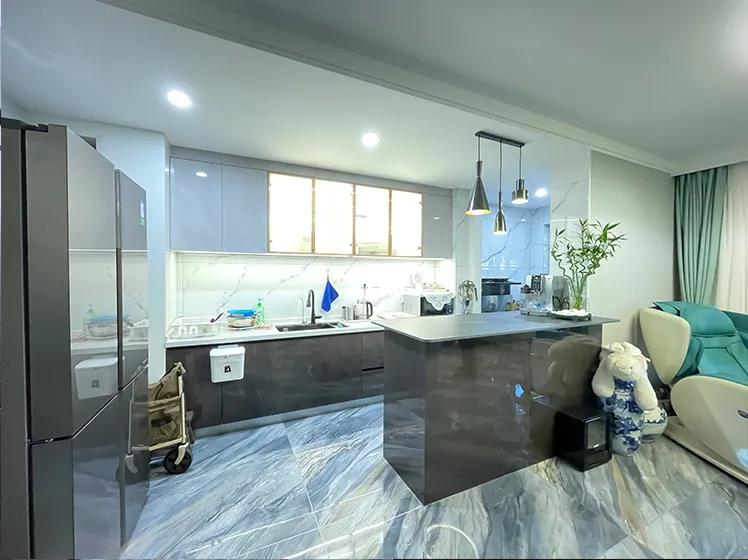 結(jié)合兩位老人的飲食習(xí)慣,設(shè)計(jì)師將封閉廚房打造成開放式廚房,與客廳空間進(jìn)行融合,視野更加開闊。利用巖板打造的大容量島臺(tái),讓廚房空間更加時(shí)尚、前衛(wèi)。