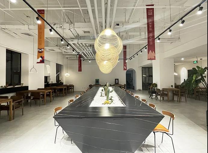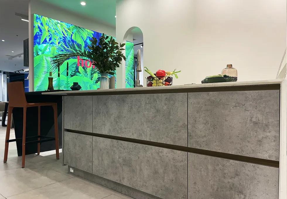 這次展館升級,以中間異形洞口為中心,劃分了三條動線,做了三個分區(qū),分別是洽談區(qū)、主材區(qū)和定制區(qū)。整個洽談區(qū)的改造,設(shè)計師以咖啡廳的整體感覺為設(shè)計來源,吧臺、回形加長導(dǎo)臺、獨立四人位桌椅,設(shè)計師在這里可以和不同家庭結(jié)構(gòu)的業(yè)主朋友們進行輕松、愜意的交流!