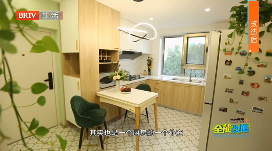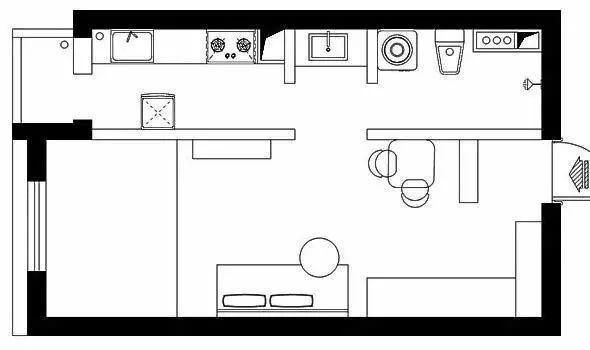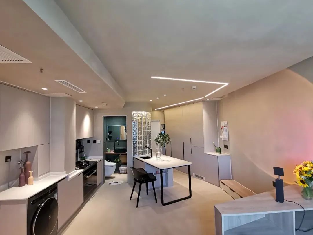 設(shè)計(jì)師賈向楠改變?cè)薪Y(jié)構(gòu)和動(dòng)線,重新規(guī)劃一條斜線異形布局,以島臺(tái)為中心,進(jìn)行U字形設(shè)計(jì)規(guī)劃,讓小戶型各個(gè)功能區(qū)完善的同時(shí),還可以互相借用空間,實(shí)現(xiàn)多功能區(qū)域聯(lián)動(dòng)。