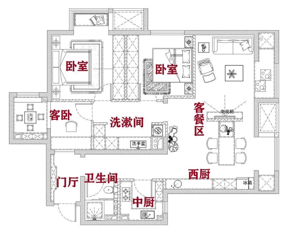 案例三:這套房子,最初是由兩套房子改成的一套四居室,筑面積118平米,三口人居住。