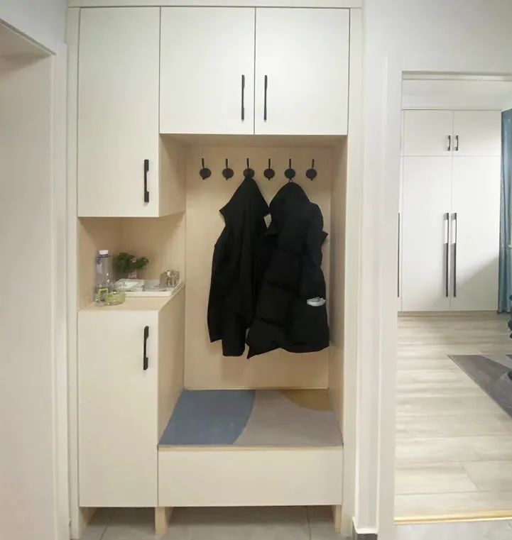 為了解決入戶空間缺乏儲(chǔ)物,及入戶門(mén)正對(duì)次臥門(mén)的難題,設(shè)計(jì)師將次臥的門(mén)向廚房方向移動(dòng)了90厘米,同時(shí)在這里做了一個(gè)凹龕,增加衣帽柜,解決了門(mén)廳的收納難題。
