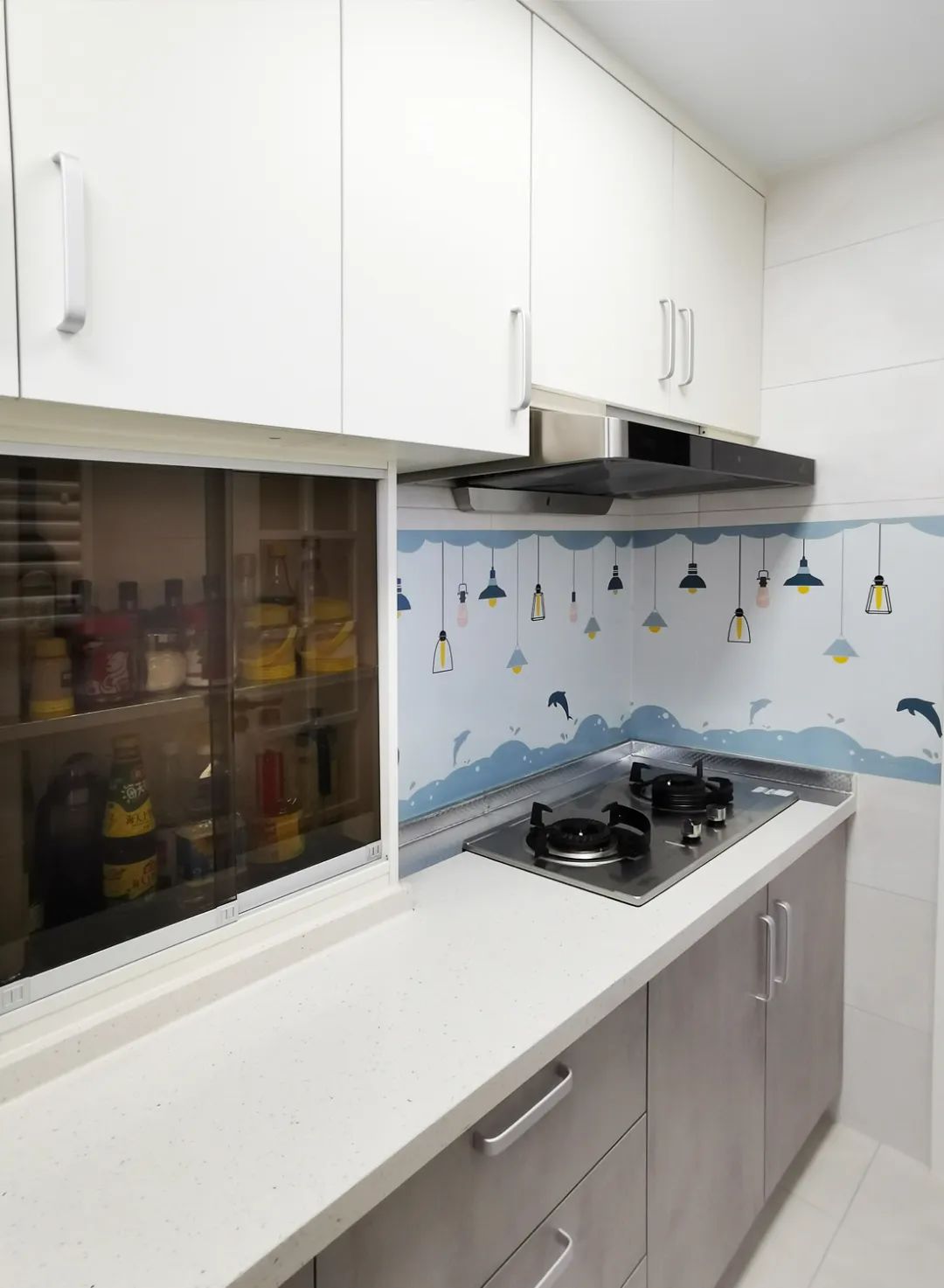 次臥門(mén)移動(dòng)后,廚房的門(mén)也隨之改變,與煙道齊平,結(jié)合潤(rùn)元的《廚房設(shè)計(jì)調(diào)研單》重新規(guī)劃了廚房,一字形櫥柜調(diào)整為L(zhǎng)形,重新布局了洗切炒動(dòng)線,歸納細(xì)分了儲(chǔ)物,同時(shí)將可利用的空間都充分利用上,讓整個(gè)廚房空間更好用。
