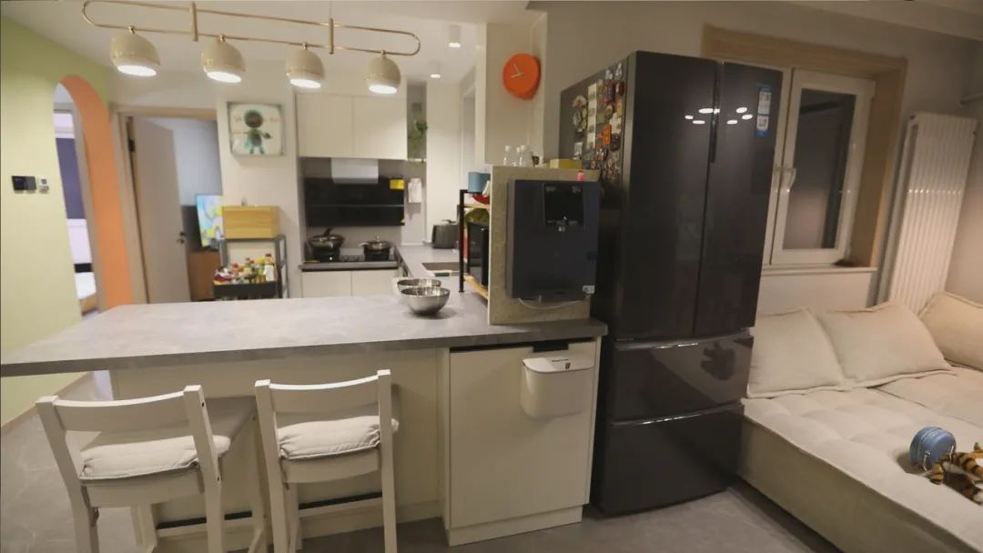 設(shè)計(jì)師拆除了廚房的部分墻體,做成開放式廚房,結(jié)合業(yè)主身高打造的不同高度的一組L型櫥柜,也方便后期使用,島臺(tái)的設(shè)計(jì),更是便于一家人的互動(dòng)溝通。廚房上的梁也被設(shè)計(jì)師巧妙隱藏進(jìn)吊頂里,整個(gè)頂面更為整體美觀。