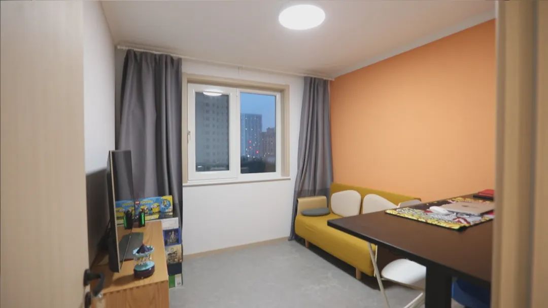 這間多功能房?jī)?nèi),沙發(fā)床、辦公桌、電視的規(guī)劃布局,可滿足謝先生的辦公、看球賽、家人偶爾留宿的多重需求。
