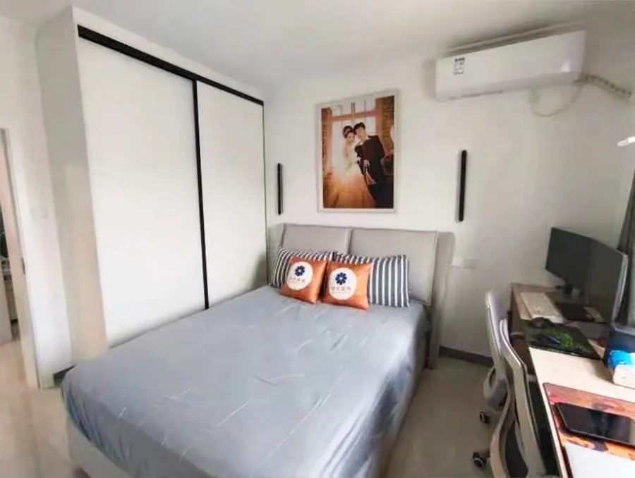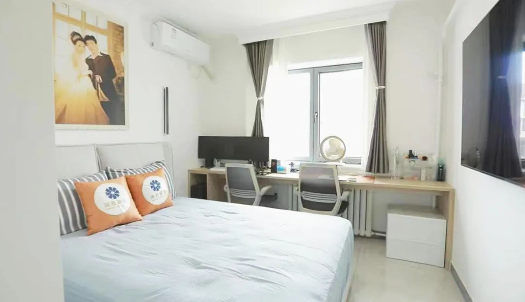設(shè)計師拆除了次臥陽臺的推拉門,將陽臺的采光引入臥室,讓整個空間更加明亮溫馨,利用潤元的定制家具,打造了一組集儲物、上網(wǎng)休閑的多功能定制柜,以及一組斗柜,增加了次臥的收納空間。