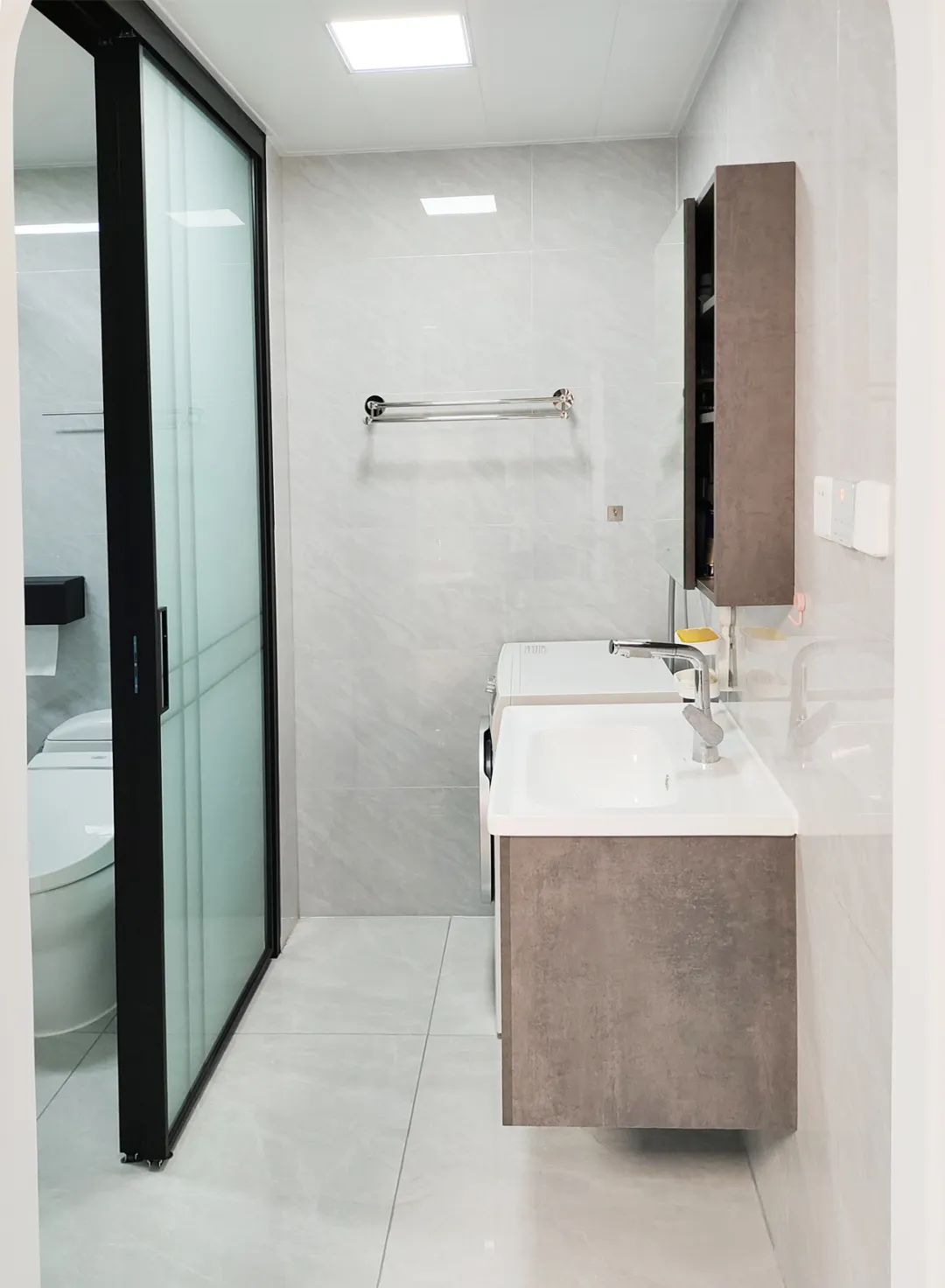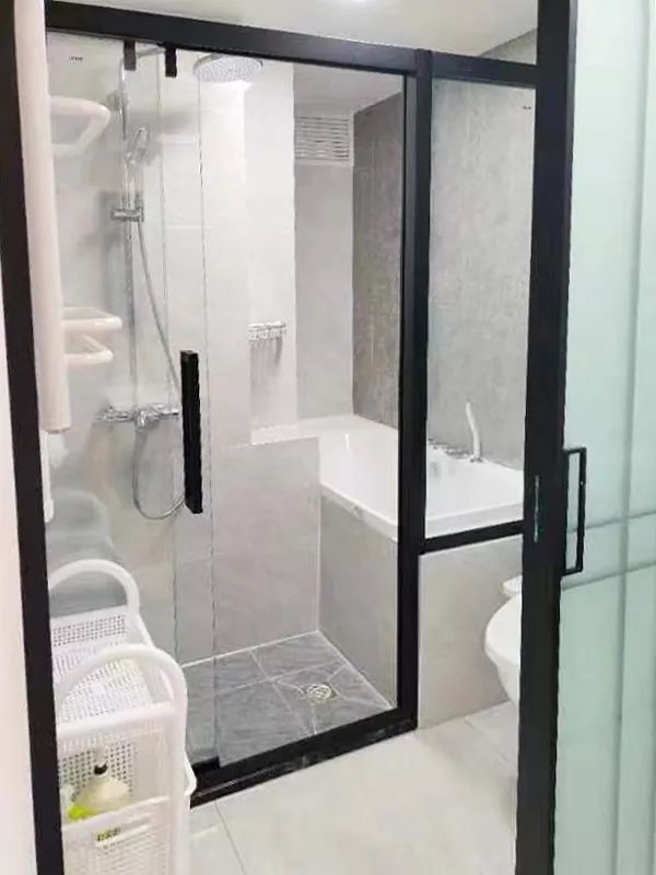 重建了衛(wèi)生間與客廳共用的一面墻體后,衛(wèi)生間面積擴大到6.5平米,設(shè)計師重新規(guī)劃出浴缸區(qū)和淋浴區(qū),滿足了如廁、沐浴、洗漱、洗衣功能。