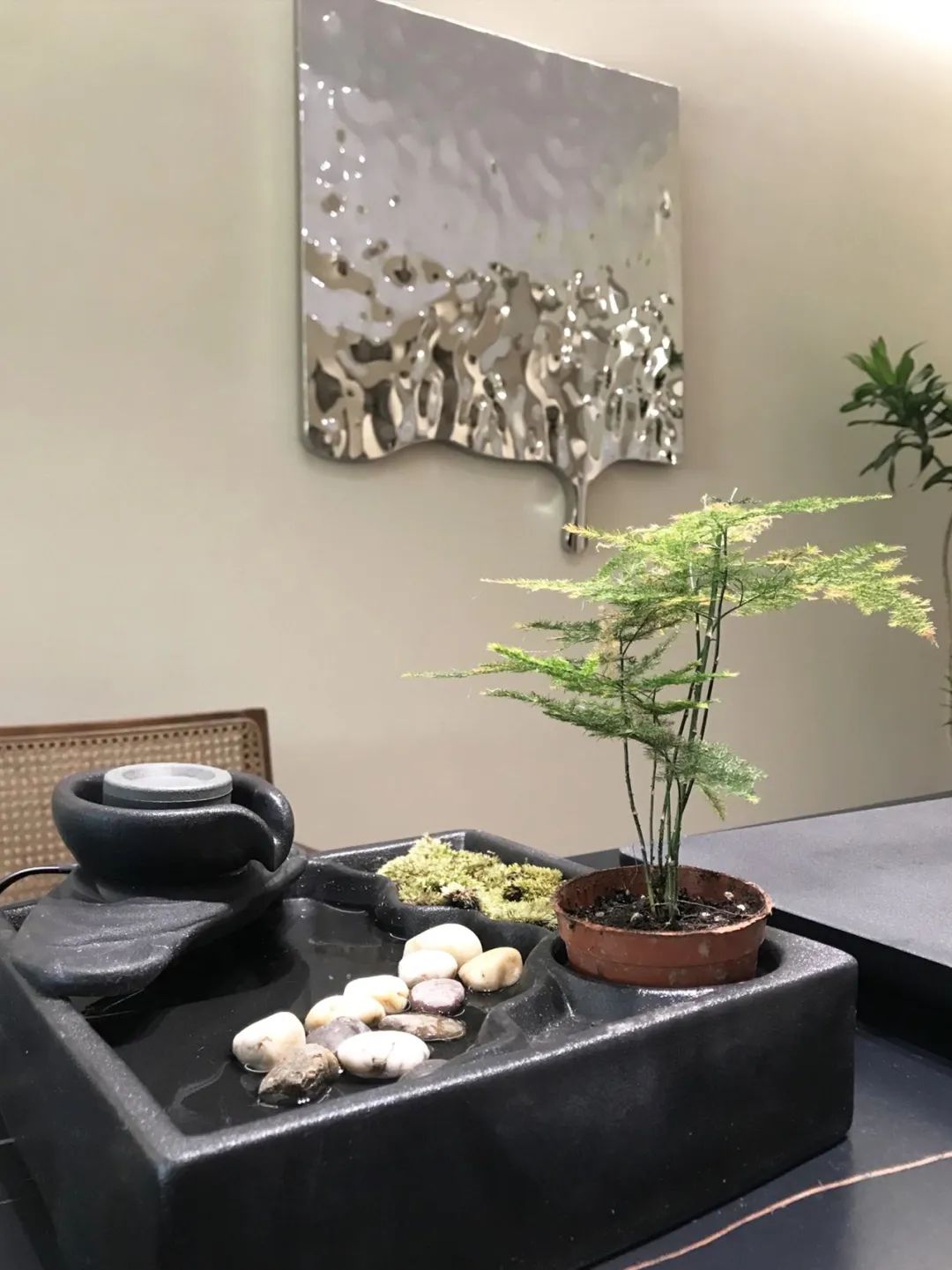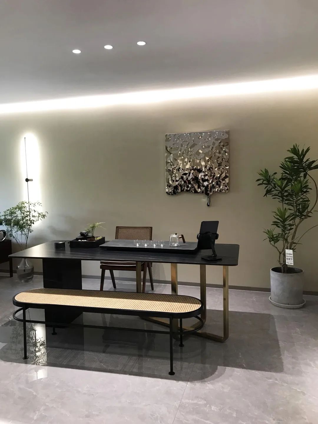 客廳一分為二,一部分擔(dān)當(dāng)會客功能,會客空間整體呈環(huán)抱式,聊天、觀影更為舒適,另一部分為餐區(qū),兼具茶歇和繪畫休閑等功能,整體空間無主燈設(shè)計,點線光源搭配軟裝,時尚前衛(wèi)。