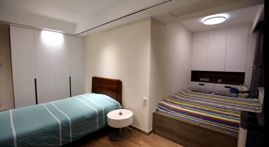 設(shè)計(jì)師將原本的臥室和儲(chǔ)物間規(guī)劃為了現(xiàn)在雙胞胎的臥室,里面利用定制家具打造了一整排榻榻米和儲(chǔ)物柜,學(xué)習(xí)桌依次擺放,滿足了兩個(gè)孩子的居住需求。
