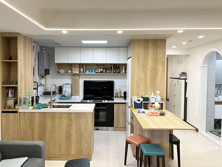 設(shè)計(jì)師拆除了原廚房和客廳共用的一面輕體墻,改為了開放式廚房,并且將整個(gè)空間規(guī)劃為了餐廚一體空間,廚房面積擴(kuò)大后,將原來的L型櫥柜改為了U型櫥柜,增加了儲(chǔ)物收納,一組高低柜,放置冰箱和折疊餐桌,用餐更方便。