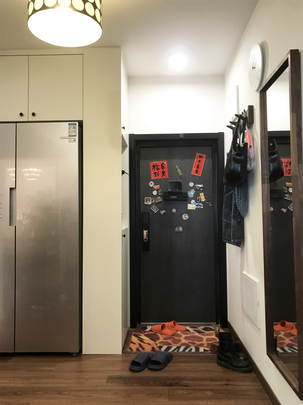 門廳面積9平米,設(shè)計師將部分門廳空間分配給了廚房和衛(wèi)生間,入戶空間一組通頂?shù)膬ξ锕駚頋M足進(jìn)門儲物。