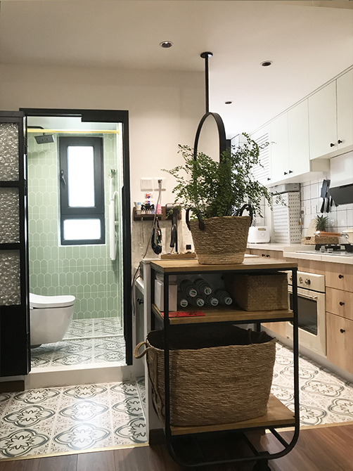 衛(wèi)生間由原來1.9平米,擴(kuò)大到現(xiàn)在的2.2平米,擴(kuò)充出來的這部分空間,作為衛(wèi)生間的洗漱空間,讓衛(wèi)生間實現(xiàn)了干濕分離。S墻的設(shè)計,讓衛(wèi)生間和廚房空間,無論從平面還是立面上利用的都更加充分。壁掛馬桶,還解決了衛(wèi)生間高臺的問題。