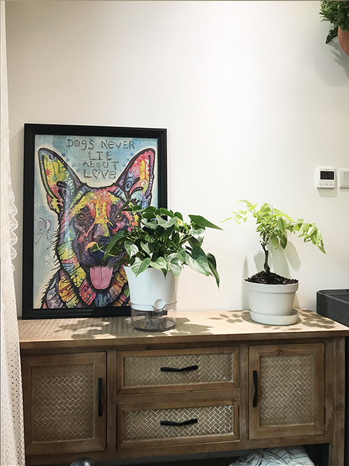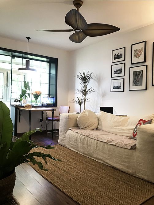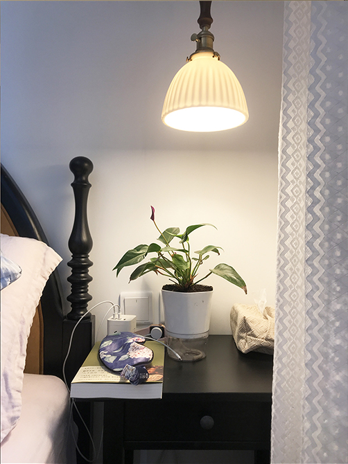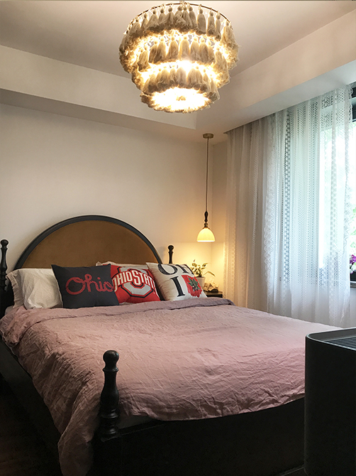 朝北的這間作為主臥室,但是因為只有8平米,所以借用了一部分次臥的空間,同時用定制家具作為這兩間臥室的隔斷,分隔主臥室與書房,節(jié)省了空間。使用風(fēng)管機(jī)代替掛式空調(diào),用吊頂把管道、風(fēng)管機(jī)設(shè)備都藏起來。風(fēng)格上,亞麻、胡桃、綠植等材質(zhì)運用,來營造南洋復(fù)古風(fēng)。