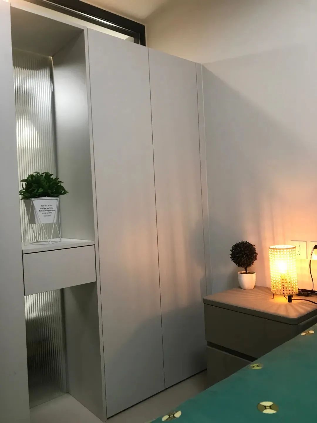 臥室的門往里推了60厘米,新砌的墻體在臥室形成一個內(nèi)嵌空間,做了兩組定制衣柜。頂面的主燈,以及燈帶,設計師也是考慮兩個人起居特點,做了特別的設計!