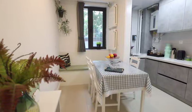 把廚房與小客廳之間的這面墻拆掉,廚房變成開放式,形成餐客廚一體化的設(shè)計(jì),融合后整個(gè)空間面積達(dá)到10.7平米。廚房一組L形櫥柜,洗、切、炒動(dòng)線合理,儲(chǔ)物充足。