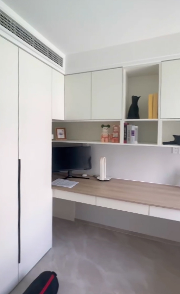縮小后的衛(wèi)生間由原來的5.7平米變成了4.7平米,設(shè)計(jì)師合理規(guī)劃了干區(qū)和濕區(qū)。濕區(qū)2平米,放置淋浴和馬桶,利用包管道的空間,做了雙壁龕,一面放洗浴用品、一面放衛(wèi)生用品。而干區(qū),定制浴室柜,將洗手池和洗衣機(jī)進(jìn)行一體化設(shè)計(jì)。同時(shí)洗手盆下方預(yù)留了放置貓砂盆的位置,寵物方便的地方也有了。