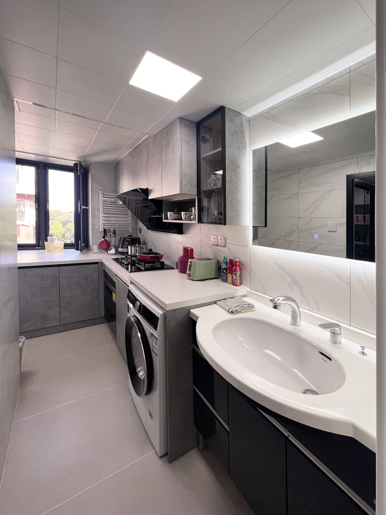 設(shè)計(jì)師先將廚房和衛(wèi)生間相鄰的這面墻往廚房方向移了30厘米,衛(wèi)生間由原來(lái)的2.1平米擴(kuò)大到現(xiàn)在的2.5平米,做了淋浴房,實(shí)現(xiàn)了馬桶和淋浴的分離,洗手盆和洗衣機(jī)依舊在這個(gè)位置,并且利用定制家具做了儲(chǔ)物空間的規(guī)劃。