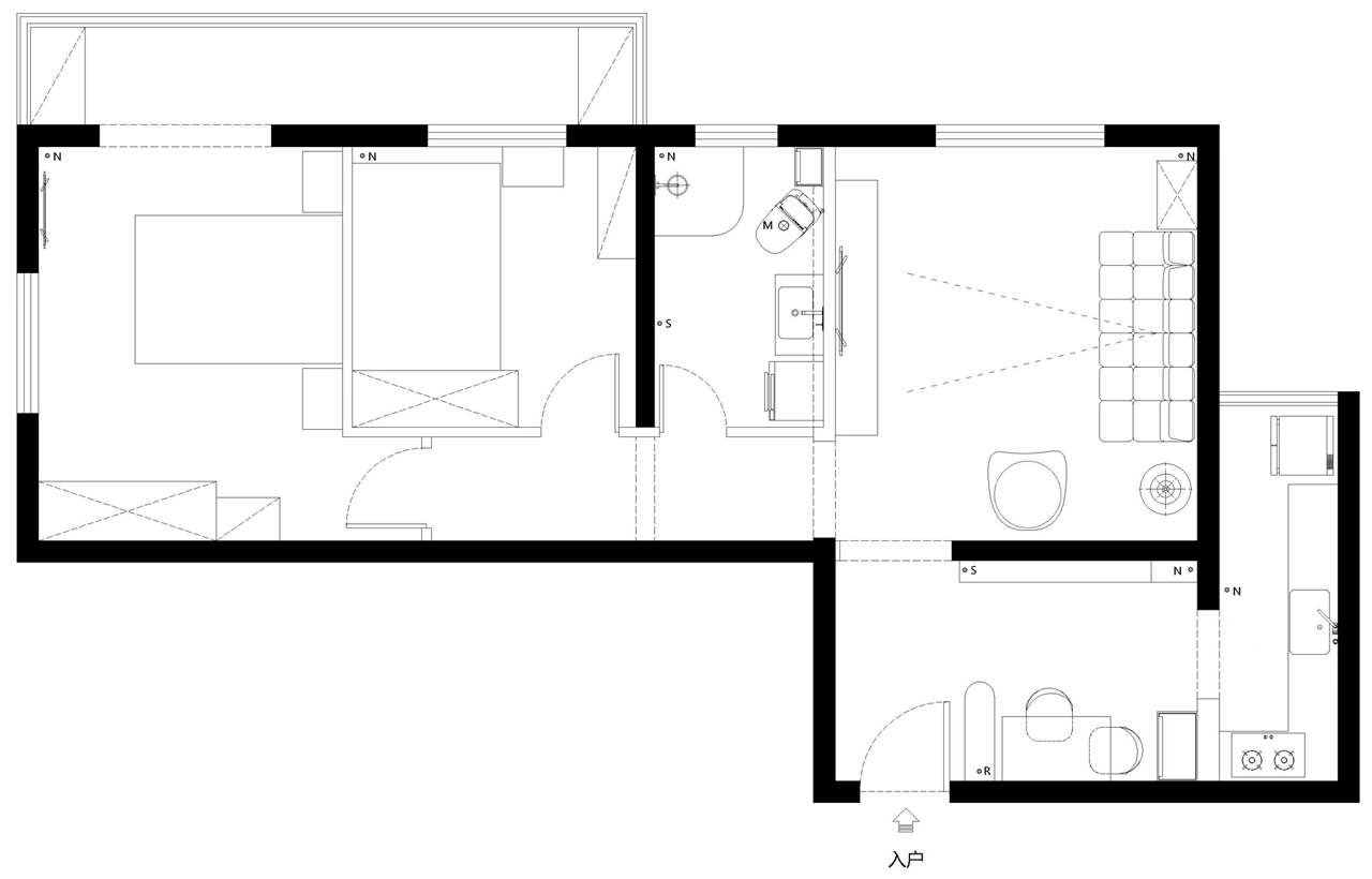 設(shè)計師將門廳和餐廳這兩個區(qū)域的功能融合,在這將近8平米的空間里,集合了換鞋掛衣、冰箱嵌入、西廚、酒柜以及家政柜六大功能,并且,還充分考慮到了水電位置、家居動線等方面,充分滿足了兩位老人對儲物的需求。
