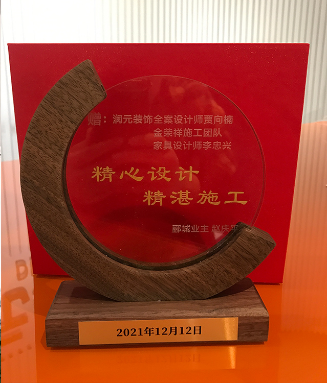 12月19日上午,酈城業(yè)主趙慶平夫婦來到潤元裝飾,將一座“精心設計 精湛施工”的水晶獎杯送到設計師賈向楠以及工長金榮祥手上,以表達對潤元設計師,施工團隊以及家具設計師工作的認可和感謝,潤元一定會以更優(yōu)質的服務回饋到業(yè)主。
