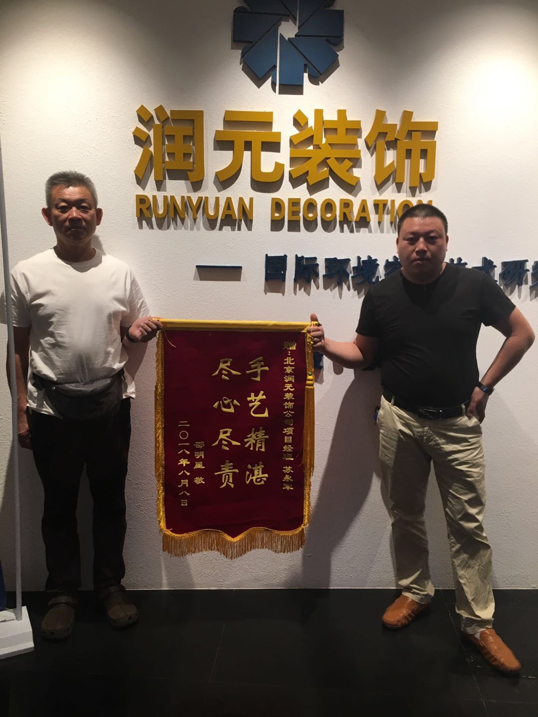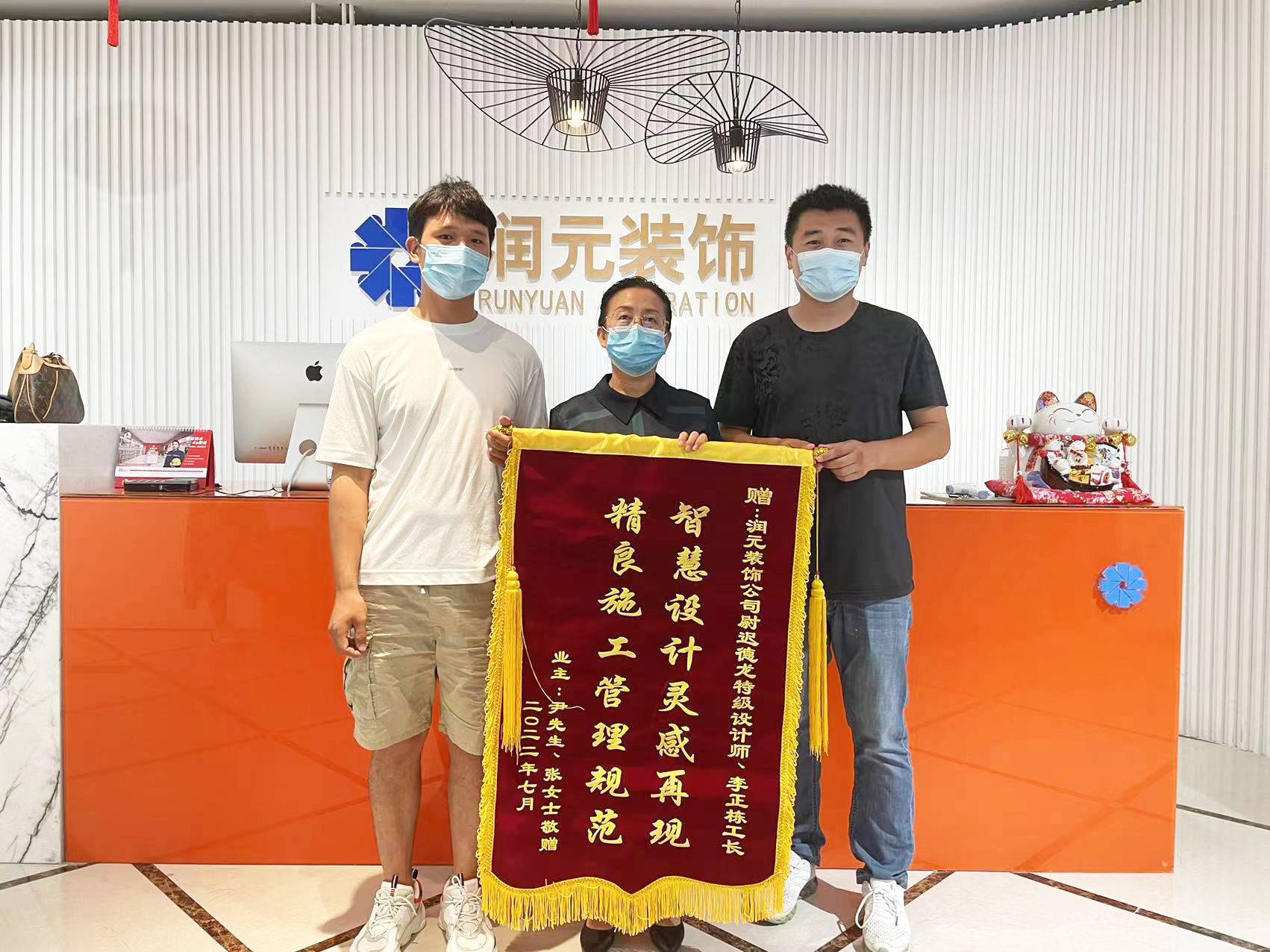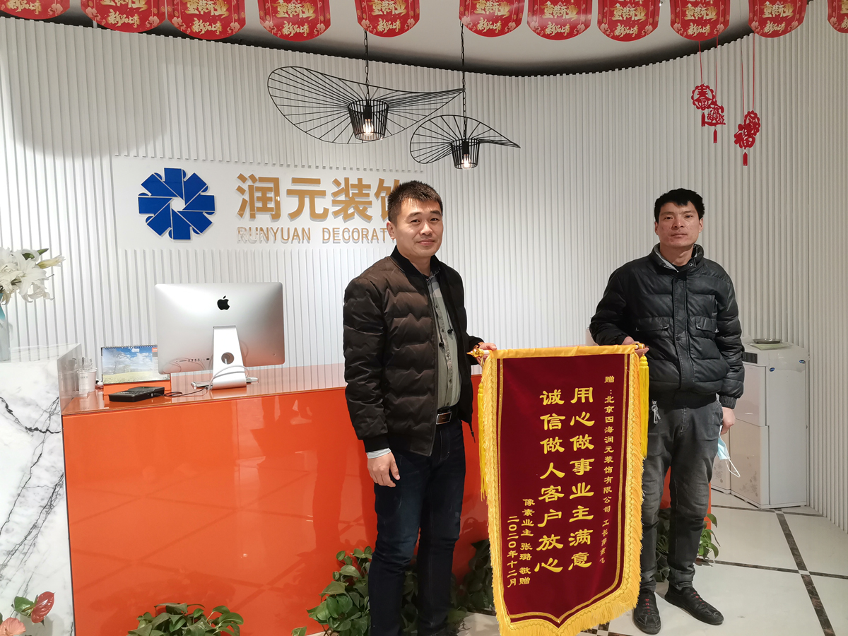 2020年8月8日,朝陽區(qū)左家莊業(yè)主來到 潤(rùn)元裝飾 帶來了一幅繡有“專業(yè)設(shè)計(jì),精心施工”的錦旗,對(duì)潤(rùn)元裝飾設(shè)計(jì)師王昊,工程部項(xiàng)目經(jīng)理史鴻飛及施工人員的認(rèn)真負(fù)責(zé)、