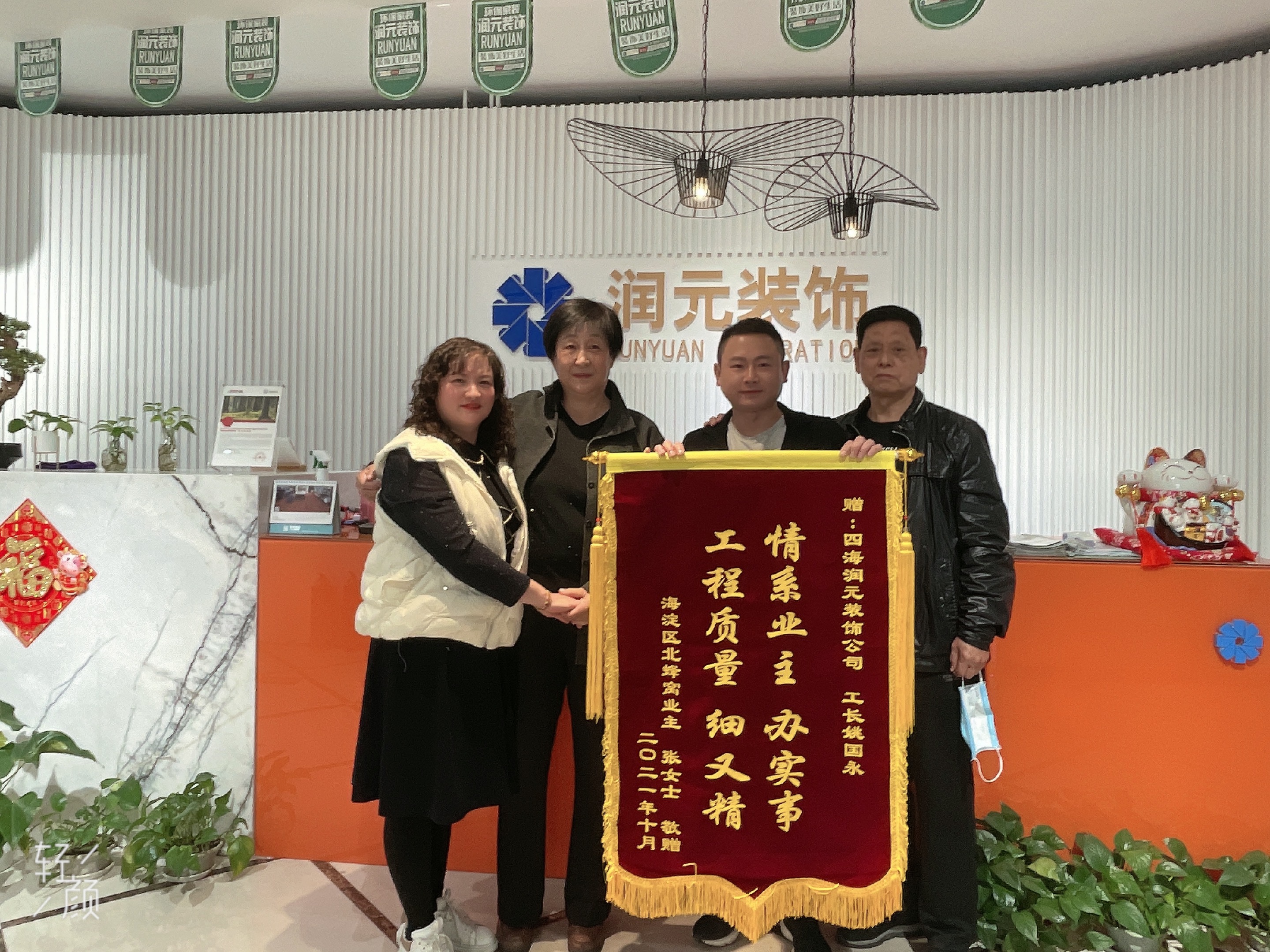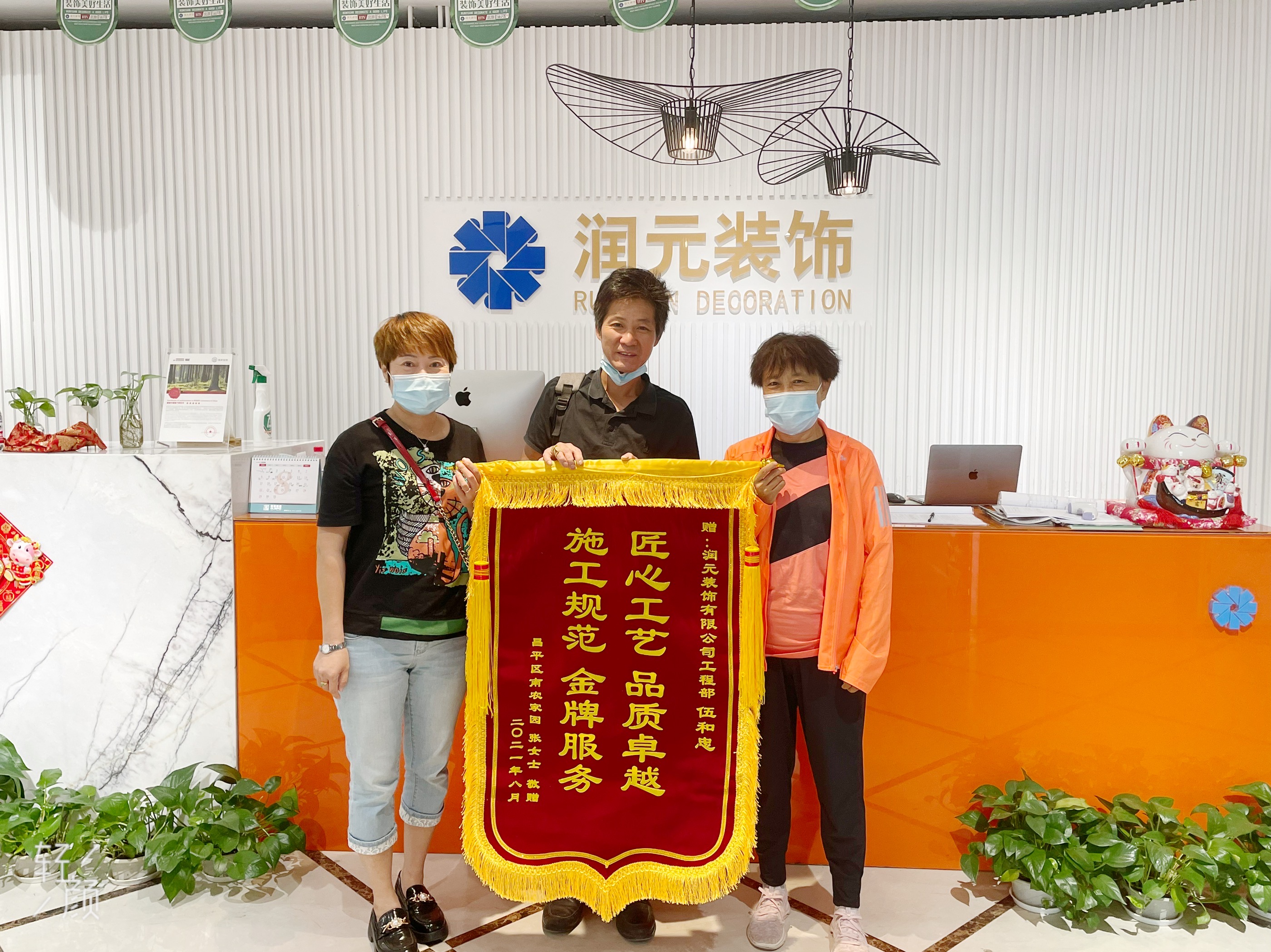 2021年7月14日,海淀區(qū)展春園業(yè)主聞女士來到潤(rùn)元總部,將一面繡有“有愛有家 有潤(rùn)元,有情有義有擔(dān)當(dāng)”的錦旗,送到設(shè)計(jì)師手上,感謝您對(duì)公司以及設(shè)計(jì)師和工長(zhǎng)的認(rèn)