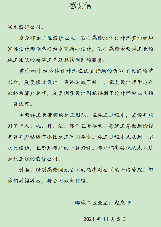 2021年11月5日,我們收到了一封來自 酈城二區(qū)業(yè)主趙先生 發(fā)過來的感謝信。信中表達(dá)了業(yè)主對(duì)設(shè)計(jì)師賈向楠的設(shè)計(jì),以及認(rèn)真負(fù)責(zé)的態(tài)度的認(rèn)可。對(duì)家具設(shè)計(jì)師李忠興從客