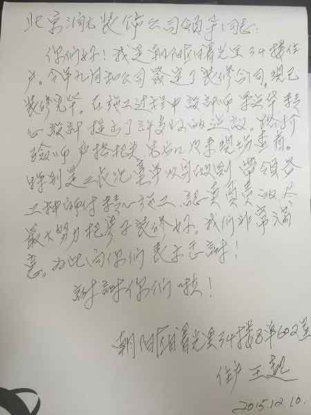 朝陽曙光里住戶王超致潤元裝飾的感謝信