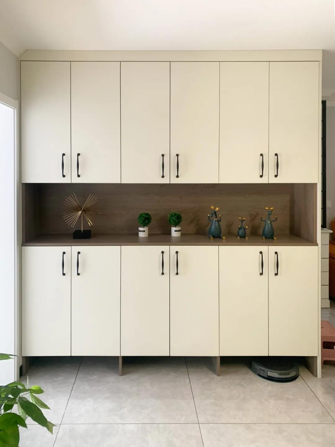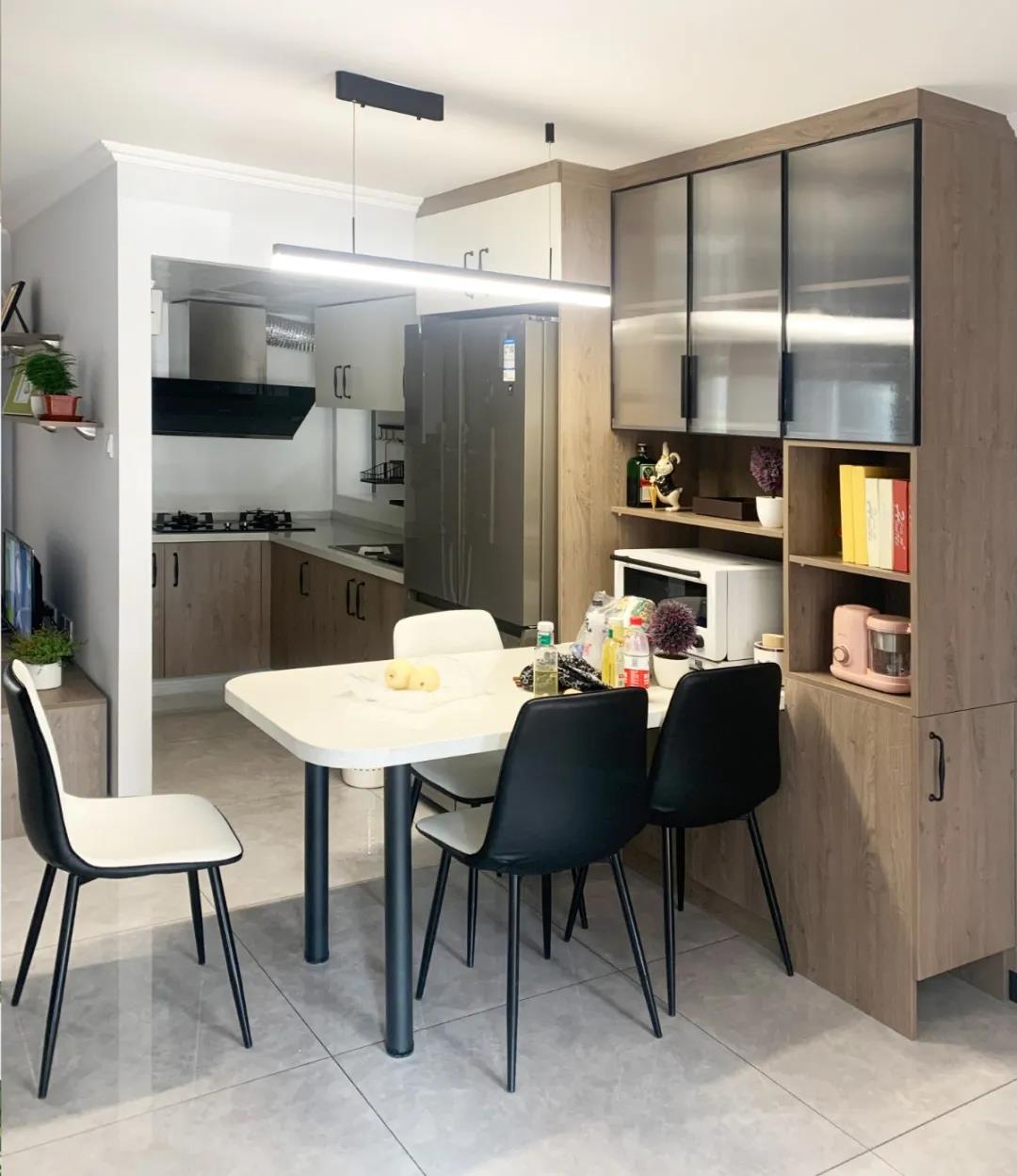 設(shè)計師拆掉了廚房與客廳間的部分墻體,同時也拆掉了廚房與門廳間的整面墻體,在此區(qū)域?yàn)楹闻恳患掖蛟炝瞬蛥^(qū),融合門廳空間,整個區(qū)域有12平米,通頂餐邊柜,滿足平時儲物需求,四開門冰箱也從廚房外移到這個位置,整個空間實(shí)用美觀。