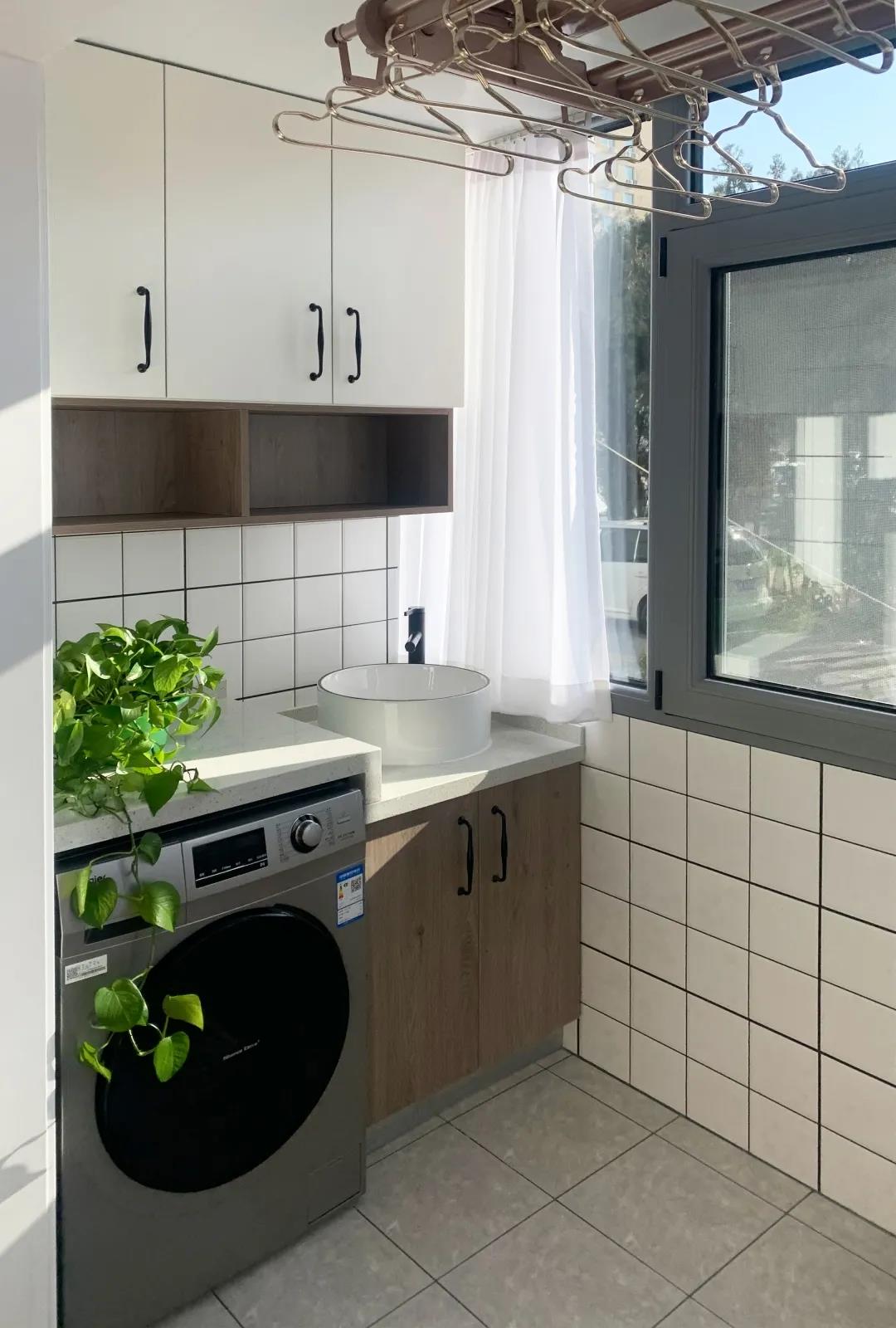 次臥是未來留給父母居住的,設(shè)計師調(diào)整了陽臺格局,將這里打造成了洗衣房,在旁邊加裝了洗手盆,洗完后的衣服直接在這里晾曬,非常方便。