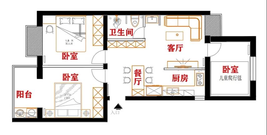2、增加用餐空間房子的原業(yè)主在家吃飯,基本沒有固定的用餐區(qū),吃飯的時候直接擺放一張小餐桌來使用,如今何女士急需一個能夠滿足未來五口人使用的餐區(qū)。
