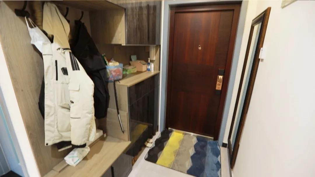 設(shè)計(jì)師在進(jìn)門右手邊為金女士打造了一組衣帽柜,頂柜存放生活用品,地柜放鞋,出門穿的外套掛在這里,鏤空部分可以放一些進(jìn)出門要用的小件物品。階梯式的儲(chǔ)物柜還兼具了換鞋凳的功能。
