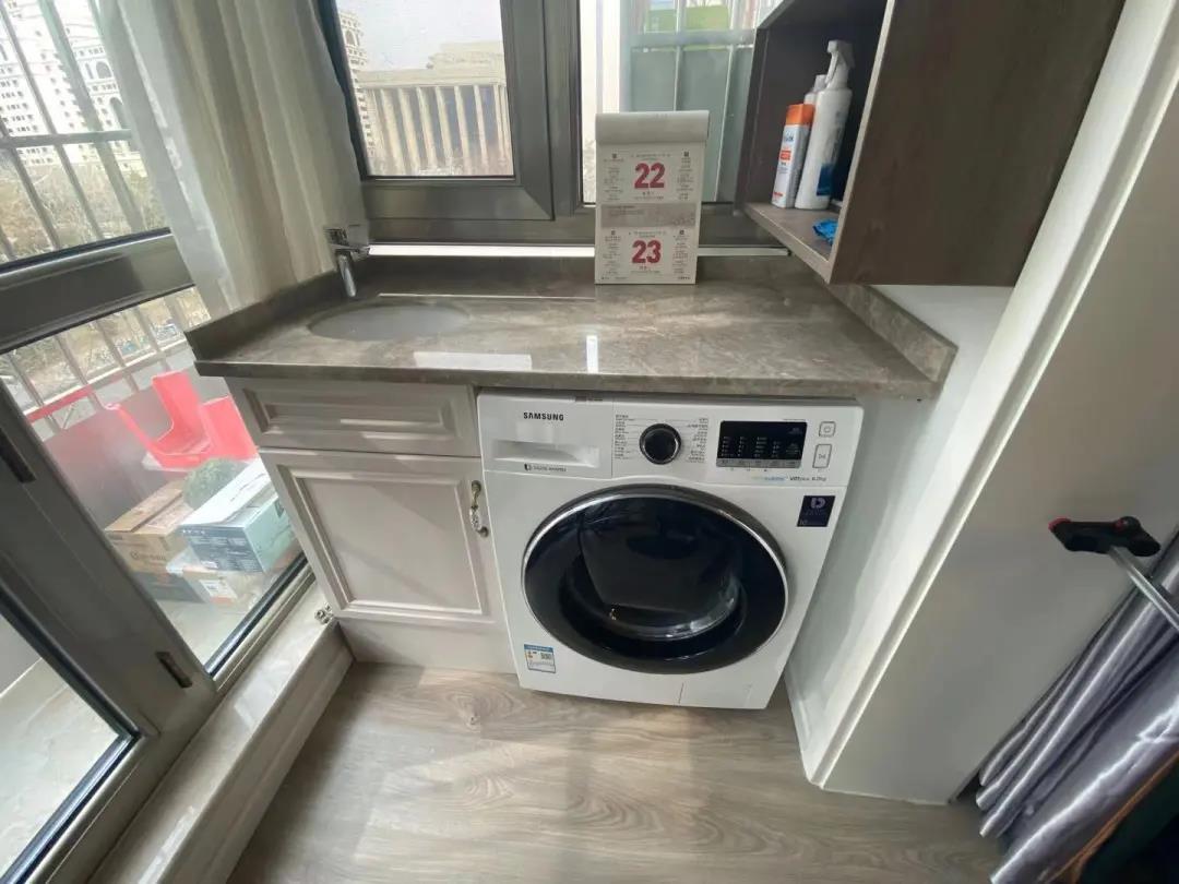 陽臺區(qū)域設(shè)計師為業(yè)主打造了多功能的休閑區(qū)和晾曬區(qū),洗衣、晾曬都很方便。利用定制家具,還打造了一組陽臺柜,存放日常的洗衣用品。曾經(jīng)閑置的區(qū)域,搖身一變成了兼具休閑、洗衣、晾曬、儲物的多功能空間。