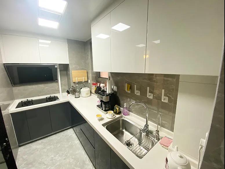 設(shè)計(jì)師改動了廚房的墻體后,櫥柜可以做成L形的,提高了利用率。并且這面墻向門廳移動了8厘米,操作空間也變寬敞了。洗切炒動線合理,儲物充足,小家電也有了更多的擺放位置。